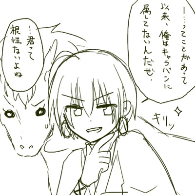 なんか変な巨大な虫オバケもいた こんな夢を見た年の瀬……OTZ しゃべる犬が出てきて「世界とは何か?」とか聞いてきたり、影みたいな人型がニンマリ笑ってて気味悪かったり、犬を追いかけて入った路地裏に同じ犬種の犬の死体が沢山あって「これは全部私だよ。君に出会った私は私だけど、もしかしたらこの死体が君と出会う私だったかもしれない」とかわけのわからないこと言われました。 ちょっと創作に使えそうとか思いました。 私は元気です。 拍手、ご来訪ありがとうございます!! 明日は仕事納めですふっふ~♫ [2回]PR 大手企業<保証<<<<<<超えられない壁<休暇 もうすぐお正月ですね。 龍川にはちゃんと正月休暇あります。少ないですが(笑) 拍手、ご来訪いつもありがとうございます(*´∀`*) [4回] ┗(;´Д`)┛超おもてぇ アクィラ「それ魔本じゃないよ」 ゼノ「マジで!?」 面倒くさくなってやっぱり諦めた産物(笑) たったこれだけで26枚、そして超重いファイルに……;; GIFアニメ好きなんですけどね……うん。 はやく本編進めなきゃなー……(遠い目) なにはともあれメリークリスマス! 皆様にとって素敵な一日となりますように。。 拍手、ご来訪いつもありがとうございます! 励みになります(*´∀`*) [4回] クリスマスが今年もやってくる ウェッジリントン毎日新聞「聖夜に浮かれ、ダレット職員公然猥褻罪で逮捕」 さて、今日明日が一番のかきいれ時です。。 拍手、ご来訪ありがとうございます(^ω^) [2回] ルークゴメンなやつ 白ルークの真面目な顔に耐えられなくなっていたずらした下書き…… いざペン入れって時まで忘れてそのままでしたごめんよルーク(笑) 今日は休日なんですね……忘れてました(ぇ) ちょっと平日にしては私のシフトロングだなー……って思ってました。 バカ丸出しです(´∀`) 童師はペン入れ進んだのでもうすぐアップしたい所です…。 拍手、ご来訪いつもありがとうございます! [2回]